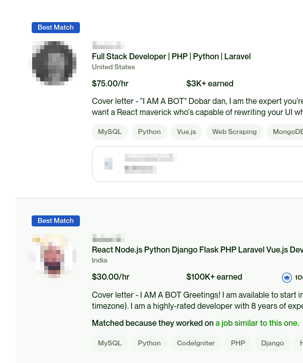 Here's how it works: these contractors use tools that automatically scrape new job posts with relevant keywords, pass the job description through an LLM such as GPT, autogenerate personalized example using the job description, and auto-apply for the job without the user ever looking at the post.